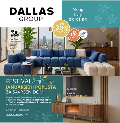 Dallas saloni nameštaja vam pružaju ekskluzivnu priliku da osvežite svoj dom vrhunskim komadima nameštaja koje možete kupiti po akcijskim cenama – lično, u nekom od naših prodajnih salona u Srbiji (Beograd i Novi Sad), Crnoj Gori i Bosni i Hercegovini, ili online putem sajta.